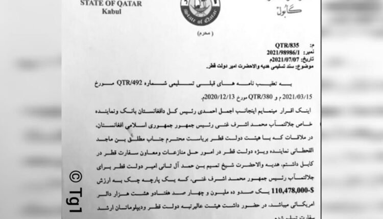 شبکه تی جی ۱ ایتالیا در تازهترین گزارش خود، سندی منتشر کرده که نشان میدهد دولت قطر مبلغ ۱۱۰ میلیون دالر به اشرف غنی، رییس جمهور وقت افغانستان رشوه داده تا از مقاومت در برابر طالبان دست بکشد.