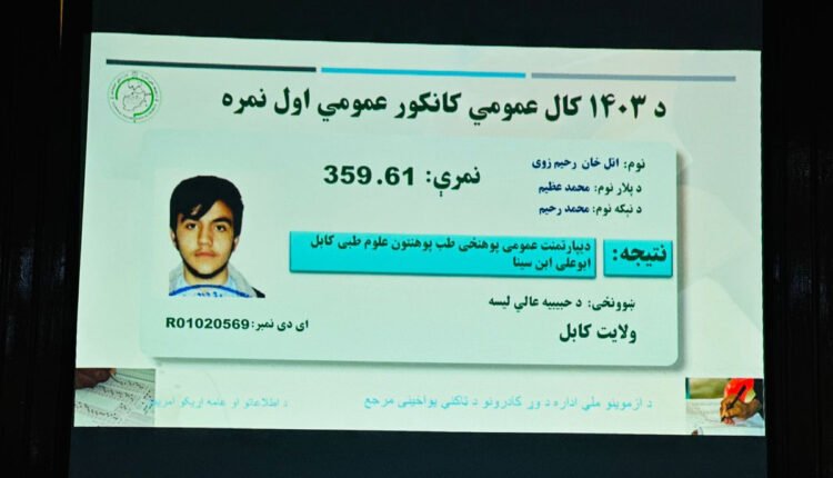 اتل خان رحیم‌زوی از لیسه عالی حبیبیه کابل با کسب ۳۵۹.۶۱ نمره، رتبه اول را به دست آورد و به دانشگاه طبی کابل راه یافت. نفرات دوم تا پنجم به ترتیب از ولایات بلخ، فراه، لغمان و هرات بودند، که نشان‌دهنده تنوع جغرافیایی شرکت‌کنندگان است.
