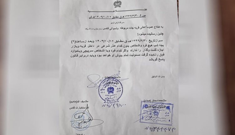 ولسوالی، فرماندهی امنیه و ادارهی استخبارات طالبان در ولسوالی قادس در یک اعلامیهای که دیروز (چهارشنبه، ۱۲ جدی) منتشر شده، گفتهاند باشندگان این ولسوالی «بدون عذر شرعی» نمیتوانند بعد از ساعت ۹:۰۰ شب در داخل روستاها و بازار گشتوگذار کنند.